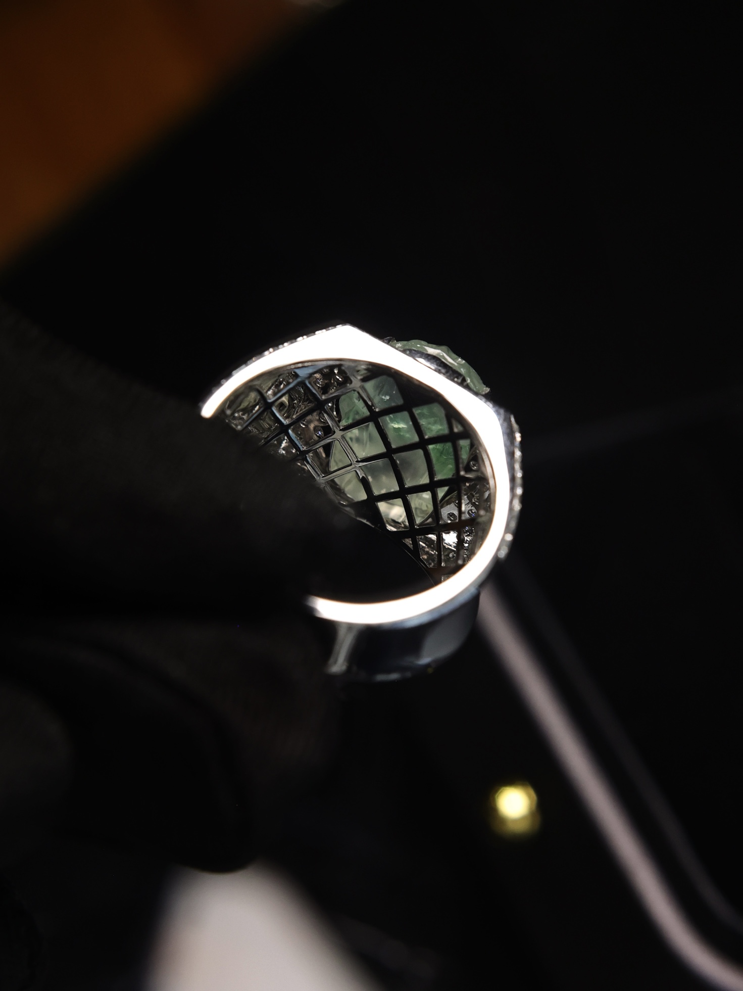 Emerald ring, full of green egg face ring, large diamond setting, overall: 23.1-22.15.5, bare stone: 15.0-13.5